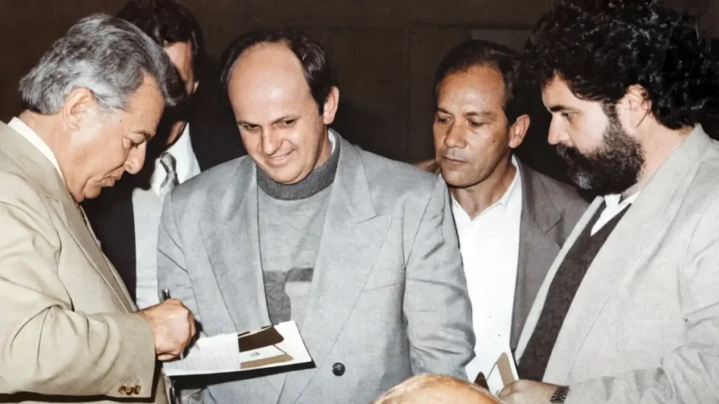 José Eduardo de Andrade Vieira, o Zé do Chapéu, ex-senador e dono do extinto Bamerindus, quando estava no PTB, ao lado do médico e então vereador Dr. Batista, do deputado estadual José Alves e de Hamilton Cardoso. Foi dos tempos do PTB que veio o famoso “Bate e confirma”.
