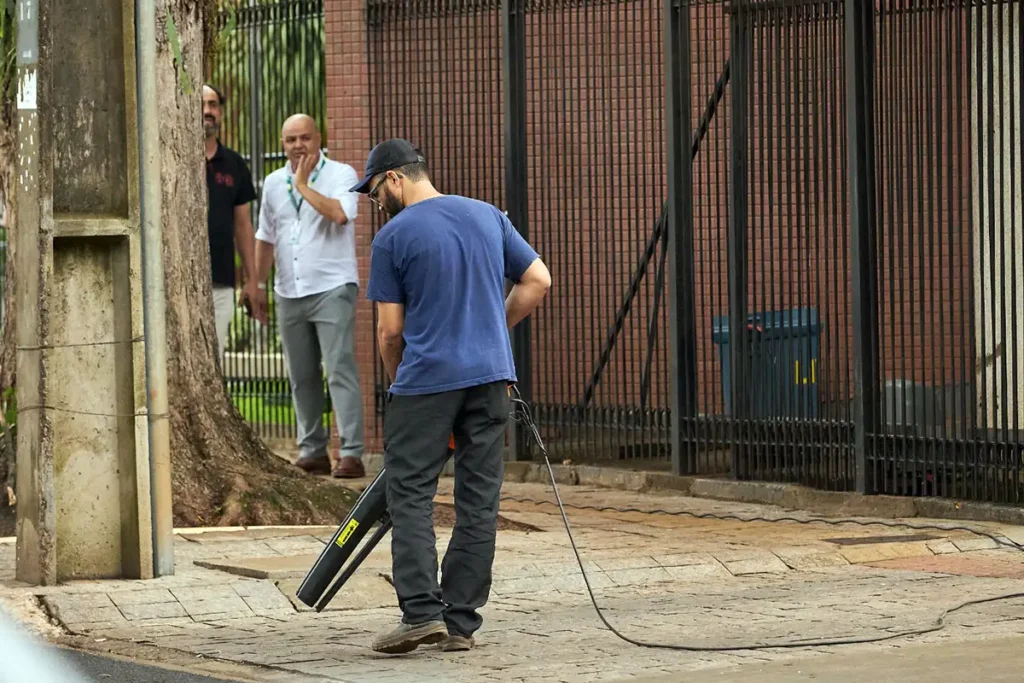 Calçada na frente da Câmara com o tal soprador que estava quebrado mas não estava e a otimização do tempo de serviço