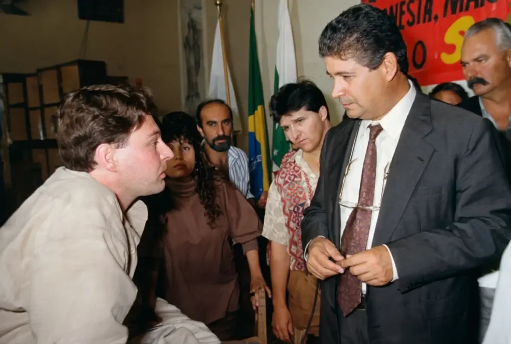 O jornalista Antonio Carlos Moretti “conversa” com o então governador Robero Requião, em evento na Igreja São José, na Vila Operária. Requião pegou no pé de ACM porque à época estava brigado com os Macarini, donos da Folha de Londrina,