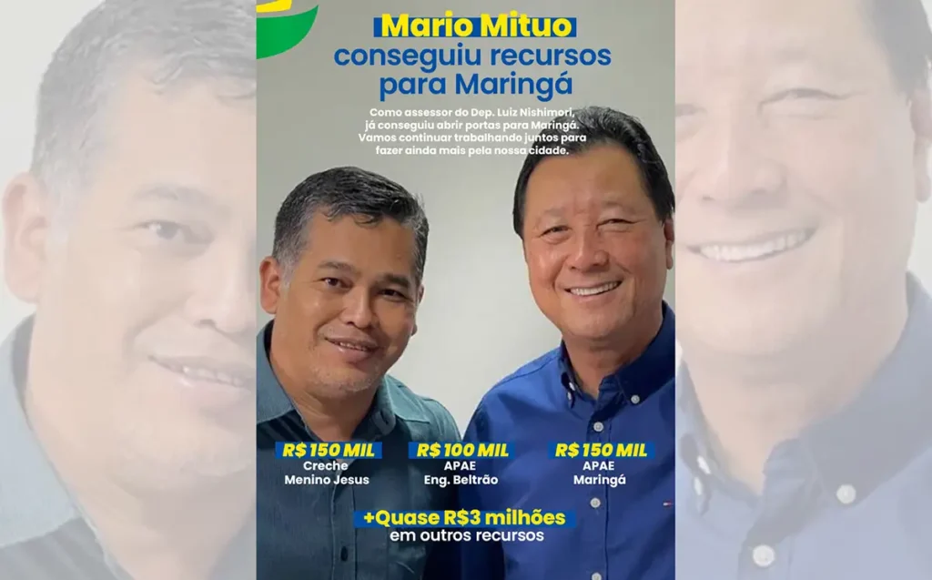 A depender de postagem em rede social, Mário Mituo, assessor do deputado federal Luiz Nishimori (PSD), vai ter que receber uma homenagem dos vereadores por viabilizar recursos para Maringá e região.
