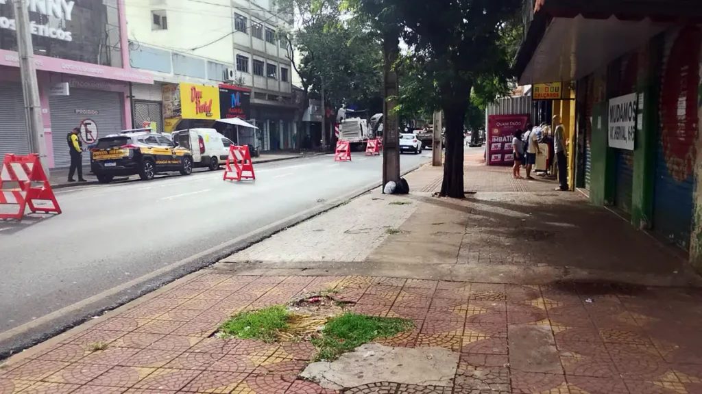 A rua Joubert de Carvalho, região central de Maringá, foi parcialmente interditada para reperfilagem. Nessa via, assim como em tantas outras, há tantos buracos nessa via que carros, motos e pedestres têm dificuldade imensa em transitar. Foto de André Venerucci.