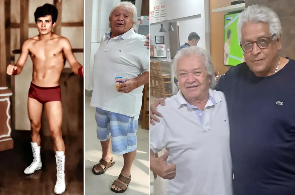 Agnaldo da Silva, o Naldinho, aparece na foto acima em dois tempos: em 1968, pronto para a luta livre no Circo Flexas Humanas (a primeira foto foi colorizada) e quinta-feira, ao lado de Devanir Almenara, seu fã número 1, durante confraternização da Turma do Vapor, patrocinada pelo genro Adélcio Cardoso, no Country Club.