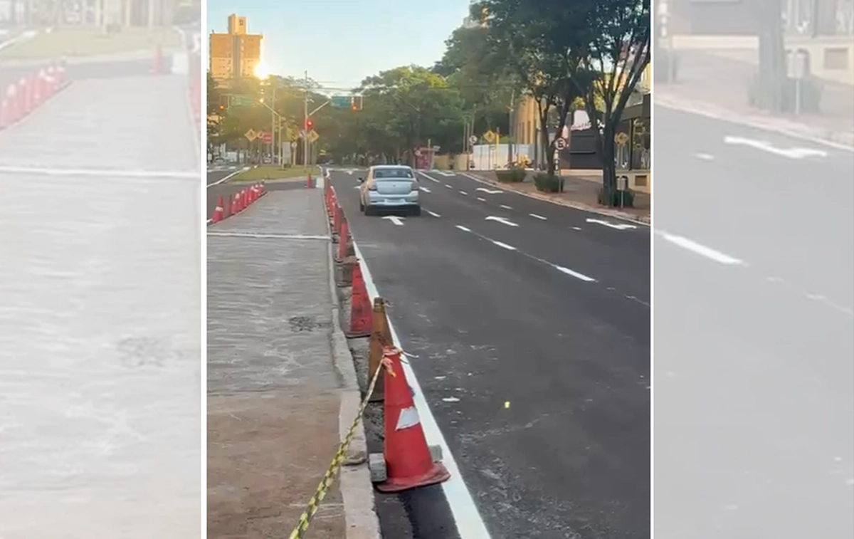 A pavimentação asfáltica em fase final, nesta noite, na avenida São Paulo, área central de Maringá, onde se abriu uma cratera no dia 13.