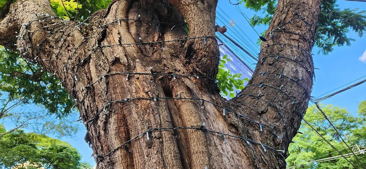 Todo final de ano árvores enfeitadas na cidade encantada, mas, durante 335 dias as mesmas árvores suportam as injúrias. Ingratidão é humana, perdoar é flora. Foto de Jorge Villalobos.