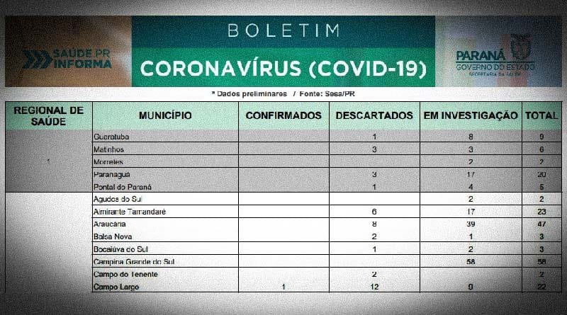 Os boletins do coronavírus divulgados pela Secretaria de Estado da Saúde não trazem os mesmos dados divulgados pela Secretaria Municipal de Saúde de Maringá. Os boletins são divulgados diariamente ao final da tarde e início de noite. A Sesa informa no seu informativo que os dados são preliminares.
