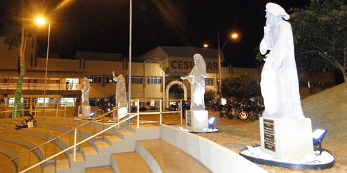 A Praça do Conhecimento no campus do Cesumar ganhou ontem quatro estátuas de personagens importantes no contexto de desenvolvimento da  humanidade e que representam: a religião, a ciência, a arte e a filosofia. As estátuas, feitas em concreto com 2 metros de altura cada uma, são de Jesus Cristo, Galileu Galilei, Leonardo da Vinci e Platão e foram confeccionadas pela artista plástica e coordenadora do curso de Artes Visuais, Deborah Kemmer,  a pedido do reitor Wilson de Matos Silva. A entrega das obras aconteceu diante da presença de estudantes, professores e diretores de diversas áreas da instituição. Segundo o reitor, a arte é um meio de expressão da humanidade e as estátuas são uma forma de eternizar o compromisso do Cesumar com a educação e o desenvolvimento de uma sociedade cada vez mais voltada para o conhecimento, a paz e a solidariedade. Leia mais.