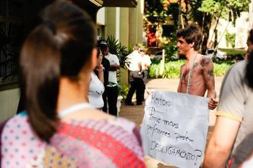 Hoje à tarde um aluno do Programa de Pós-Graduação em Educação para a Ciência e a Matemática, Gustavo Piovezan, ficou apenas de cueca e segurando um cartaz, em protesto defronte a Reitoria contra o desligamento das professoras Clelia Nogueira e Marta Bellini. “Eu não tenho conhecimento de todos os fatos pois não estou envolvido administrativamente, mas minha orientadora pode sair e estou desesperado. A saída das duas seria uma perda gigantesca para o programa”, disse Piovezan. Leia mais.