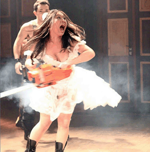 Um dos atores que participam da milionária campanha publicitária do IPTU 2011 de Maringá é Kelly Eshima, que já fez par com André Segatti na novela “Bela, a Feia“, da Record; na campanha, ela fala dos investimentos na área da cultura da cidade. Kelly Eshima é fundadora da Companhia Transitória e do Teatro de Ruído e estudou Artes Cênicas da Faculdade de Artes do Paraná. Na foto, ela segura uma motosserra numa cena de “Elizaveta Bam”, no Teatro Novelas Curitibanas, ano passado.