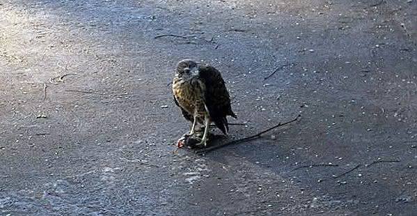 Este é o filhote de gavião, aquele do Paulo Kato (entenda aqui). “Já voa sozinho, mas, ainda não foi embora. A mãe trouxe-lhe um rato e entregou nos altos da árvore, mas o filhote derrubou, daí desceu e está comendo no chão…”, conta ele.