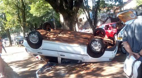 “Já que a moda de Maringá é ficar de pernas para o ar…”, comenta Alissom, autor das fotos do acidente ocorrido no início da manhã do último domingo, envolvendo um Fusca, placa de Paiçandu, e um Gol, placa de Maringá, na esquina das avenidas Pedro Taques e Bento Munhoz. O Gol, dirigido por uma mulher de 30 anos, capotou; ela saiu ilesa.