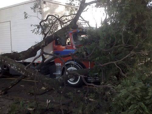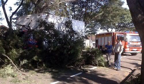 Fotos enviadas pelo Fernando mostram acidente que aconteceu hoje pela manhã na rua Néo Martins, próximo à avenida Laguna, em Maringá. O motorista nada sofreu, mas ficou preso na cabine do caminhão até os bombeiros cortarem os galhos. A impressão que passou foi de que o motorista bateu com a caçamba do caminhão em um dos galhos, forçando a queda de boa parte do tronco da árvore.