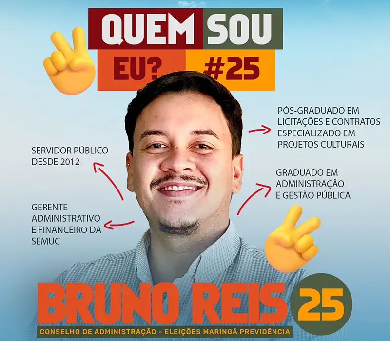 Acontece em 10 de outubro a eleição para o Conselho de Administração da Maringá Previdência e um dos candidatos é Bruno Reis, que está divulgando propostas em rede social, defendendo decisões mais eficientes e colaborativas para a vida do servidor. A votação será das 7h às 19h, de forma online ou presidencial, na sede da Maringá Previdência.