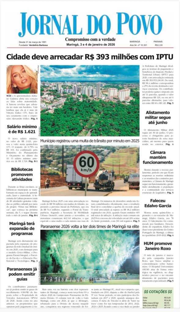 A primeira entrevista do ano do prefeito Silvio Barros II (PP) será hoje no Jornal da Manhã Maringá, que começa às 7h na Jovem Pan FM, com transmissão pelo YouTube. Ele fará um balanço de 2025 e perspectivas para este ano, na bancada comandada por Paulo Caetano.