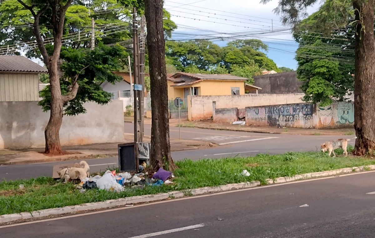 Flagrante feito por leitor na avenida Lucílio de Held, mostra dois problemas que continuam, entra ano e sai ano, em Maringá: descarte irregular nos canteiros centrais e animais soltos.