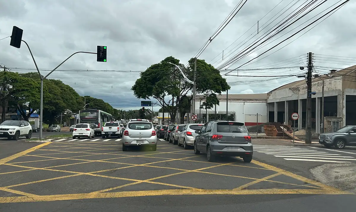 Apesar de o semáforo estar no verde, o trânsito na avenida 19 de Dezembro estava congestionado, para variar. Os carros não deveriam estar na chamada área de conflito, pois causa mais congestionamento.