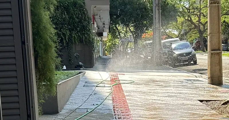 Na avenida Tiradentes, furos na mangueira fazem surgir um chafariz na calçada.