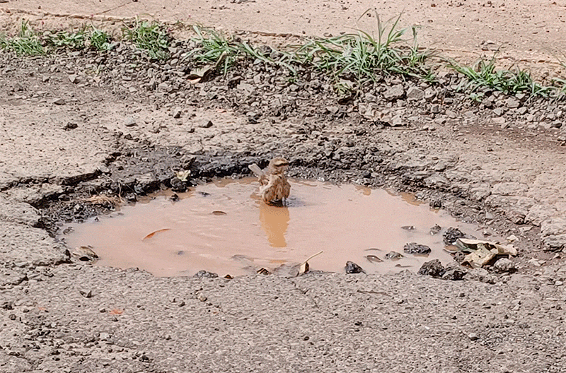 Um passarinho aproveita-se bem da água acumulada num buraco no asfalto do Residencial Athenas e toma um banho. Fotos de Jorge Villalobos.