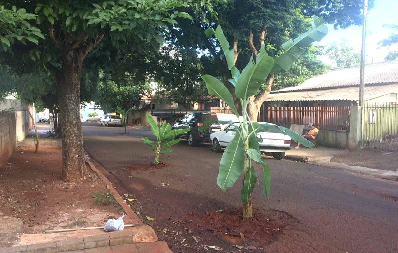 Bananeiras no asfalto da rua José Cividanes, no Jardim Planalto, em Marialva.