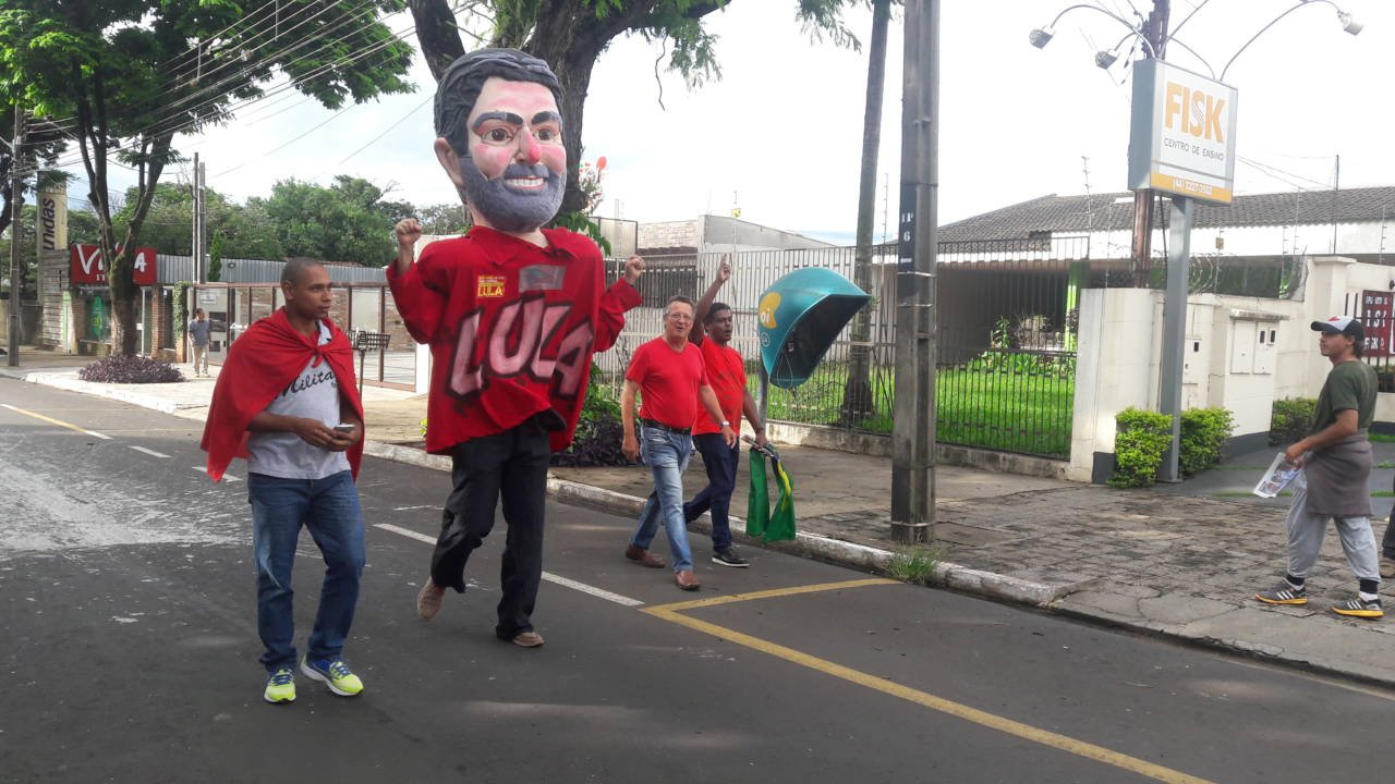 Manifestantes, um deles com o boneco representando Lula, chegam para o evento programado para as 9h30 no plenário da Câmara de Maringá. O pessoal tem vindo pela avenida Cerro Azul, com carros estacionando nas proximidades do cemitério municipal.