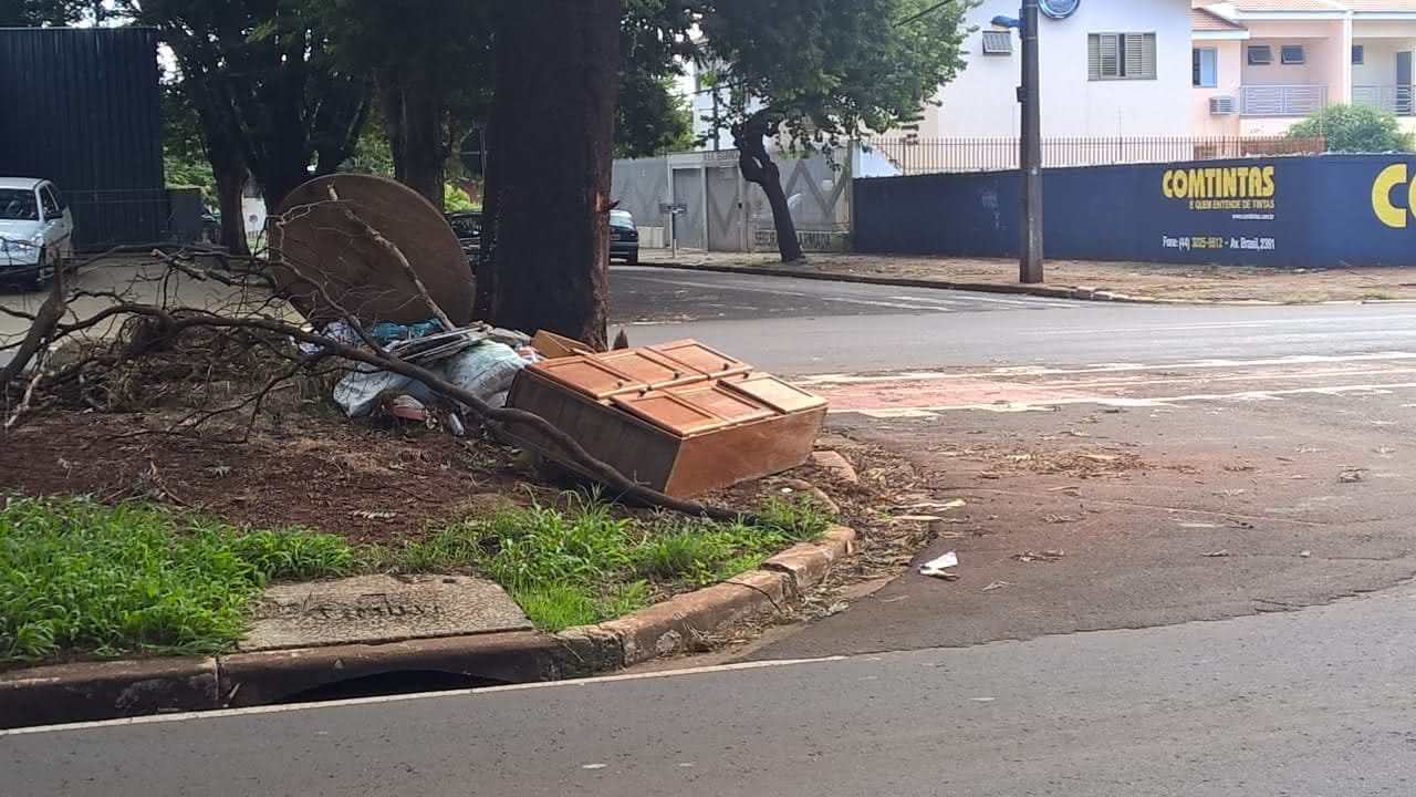 Canteiro central, começo da avenida Brasil, em Maringá, em foto enviada por leitor. Depois dos colchões, o descarte passa a ser de armários, mesa…