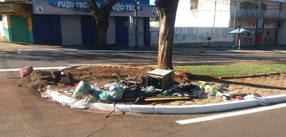 Ontem, na avenida Brasil esquina com a rua Jandaia, próximo ao antigo Aeroporto de Maringá, por volta das 17 horas, o canteiro central estava cheio de entulhos, pneus, vasos, sofá e muita água acumulada.