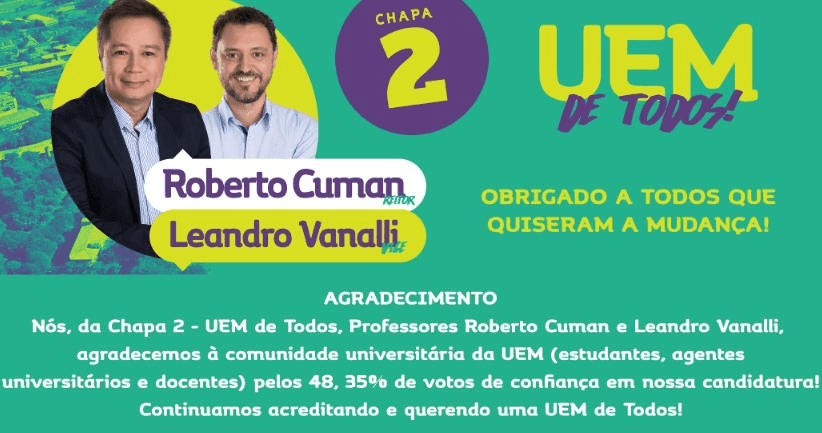 Na Universidade Estadual de Maringá, a chapa 2 encaminhou à Amusep, Amunpar, Amerios, Comcam, Amenorte e Amuvi documento reafirmando compromissos de luta pela educação pública gratuita e de aproximação da UEM com a comunidade local e regional.Continue lendo ›