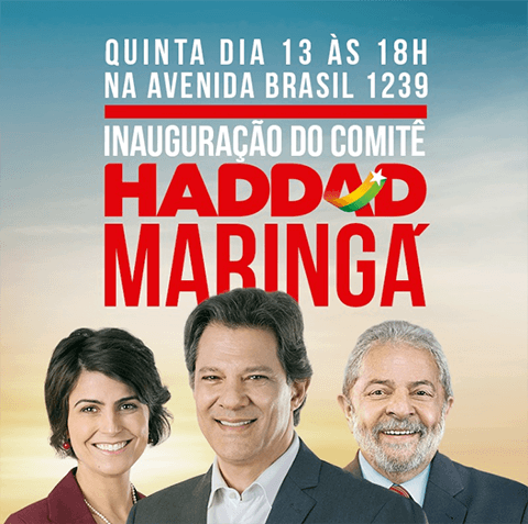 Será inaugurado nesta quinta-feira, às 18h, o comitê de Fernando Haddad (PT) em Maringá. O comitê fica na avenida Brasil, 1.239, Vila Operária.