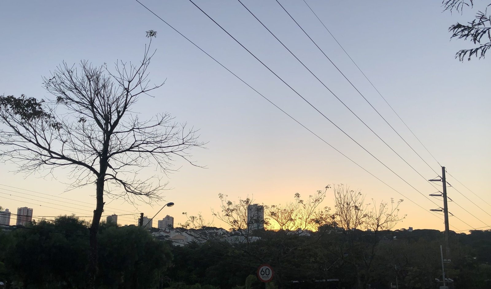 Domingo com previsão de pancadas de chuva, segundo o Inpe. Temperatura máxima de 25 °C e pôr do sol às 18h03.