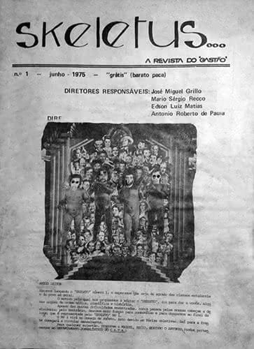 Primeiro número da Skeletus…, que se apresentava como a revista do Colégio Gastão Vidigal, há exatos 43 anos. Foi produzido por José Miguel Grillo, Mário Sergio Recco, Edson Luiz Matias e Antonio Roberto de Paula, cujas fotos aparecem na montagem da capa, infelizmente riscada com caneta. Do acervo de JC Cecílio. Aqui, em melhor resolução.