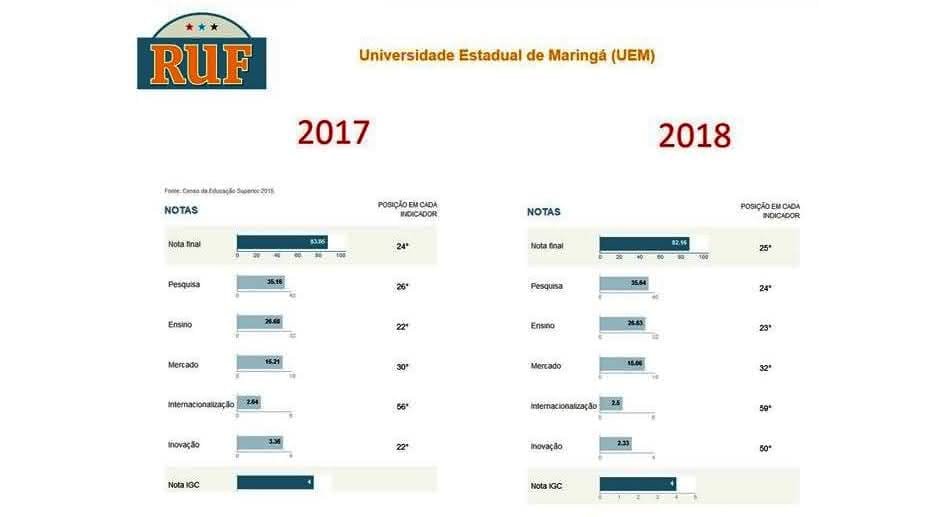Divulgado segunda-feira, o Ranking Universitário Folha (RUF), da Folha de S. Paulo, mostrou a Universidade Estadual de Maringá ocupando a 25ª posição entre as instituição brasileiras de ensino superior. Houve queda em relação ao ano passado, quando estava na 24ª posição.Continue lendo ›