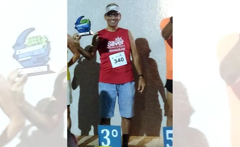 O jornalista Donizete Oliveira participou sábado da Cambira Night Run, com mais de 350 corredores. Conquistou o 3º lugar na categoria 58 a 64 anos, num percurso de 5 km. Na foto, ele recebe o troféu da conquista, com apoio da Silver Náutica, de Maringá, do empresário Ênio Ferreira Lopes.